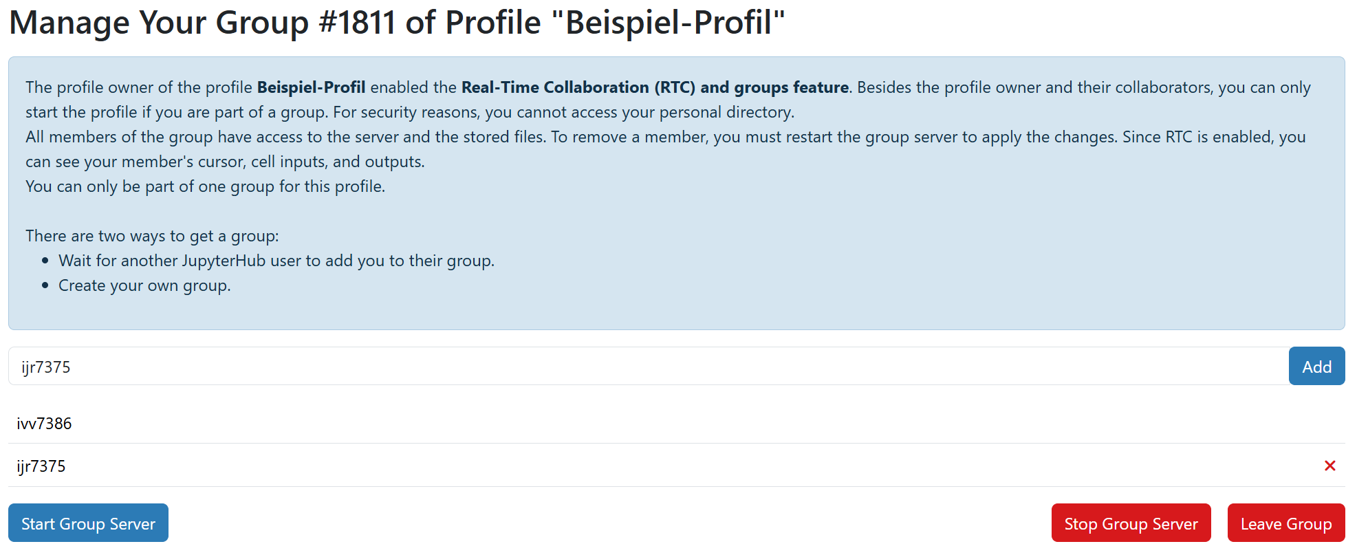 Mit diesem Feature können Studierende eigene Gruppen bilden, um zusammen und in Echtzeit an einem Jupyter Notebook arbeiten zu können.