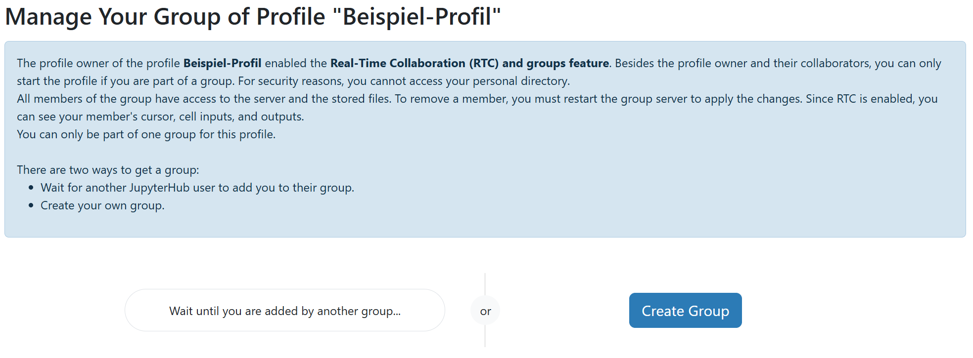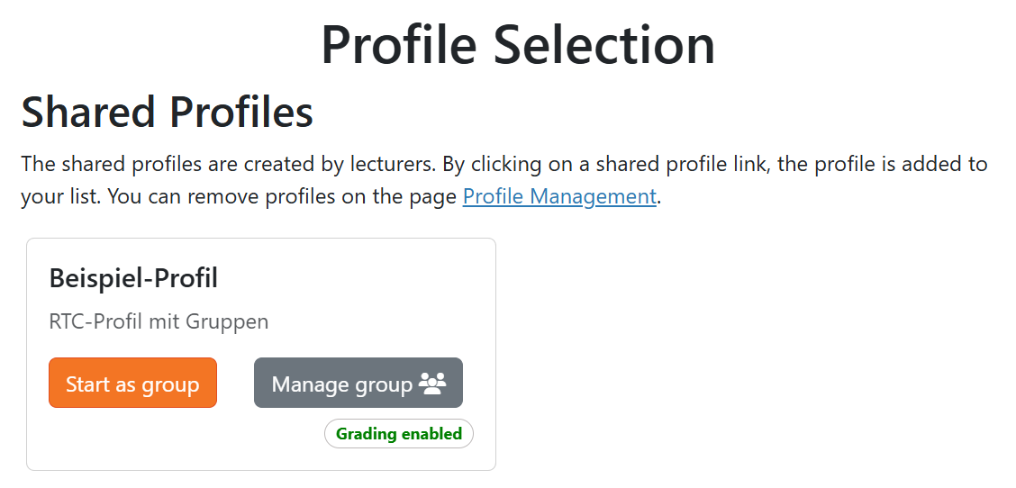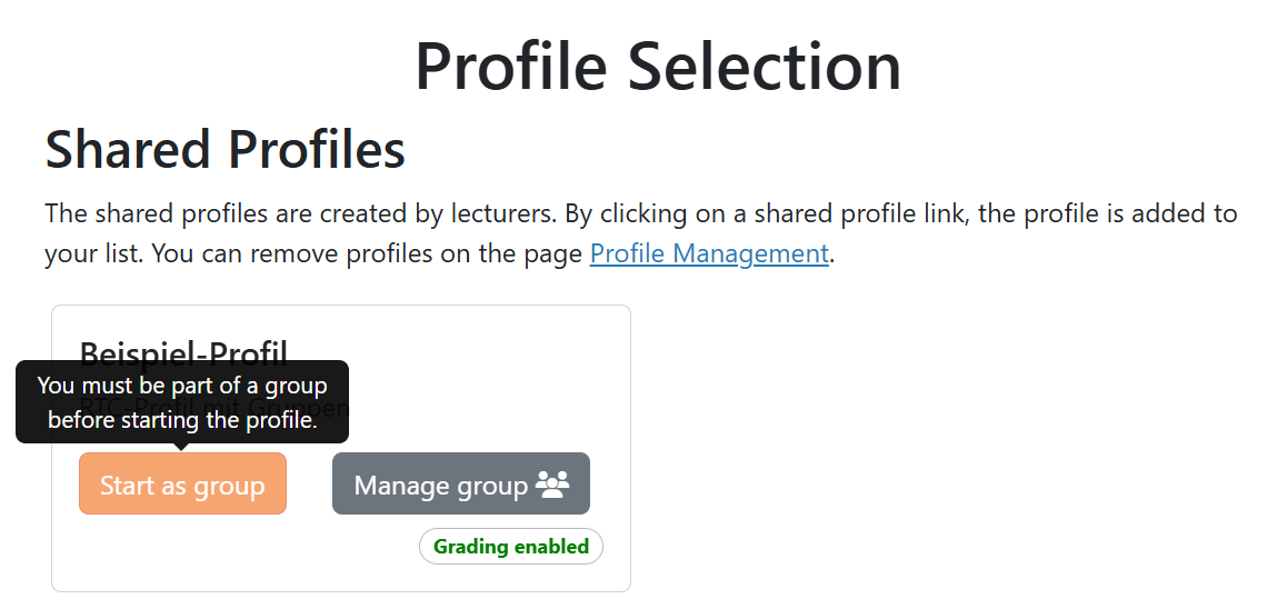 Nachdem Sie auf den geteilten Profil-Link Ihres Dozierenden geklickt haben, wird das Profil nicht wie üblich automatisch gestartet. Stattdessen landen Sie auf der folgenden Gruppen-Management-Seite. Dort können Sie eine neue Gruppe anlegen oder warten bis Sie von einer anderen Gruppe eingeladen werden.