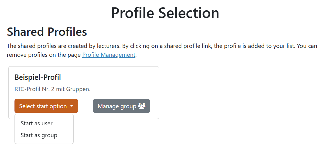 Bei der zweiten Option starten Sie das Profil als Mitglied einer Gruppe. Diese Option steht auch den Studierenden zur Verfügung. Sie können diese Option nur auswählen, wenn Sie bereits selbst eine Gruppe erstellt haben oder einer Gruppe hinzugefügt wurden (s. Dokumentation für Studierende).