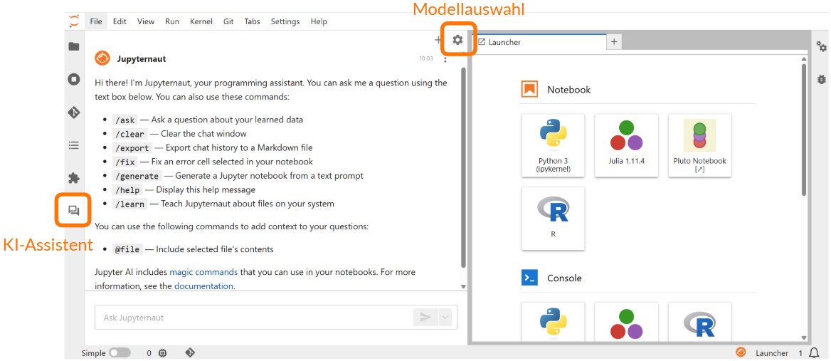 Der KI-Assistent kann auch direkt im Jupyter Notebook über sogenannte AI Magic Commands innerhalb des Python-Codes genutzt werden. Damit lassen sich im Code sowohl das gewünschte KI-Modell auswählen als auch Anfragen an dieses stellen. Die Antworten erscheinen nach dem Ausführen der jeweiligen Codezelle als deren Ausgabe.