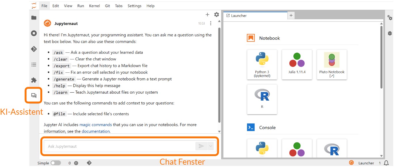 Im bwJupyter - Jupyter AI Profil steht Jupyter AI, ein integrierter KI-Assistent, zur Verfügung, der als Unterstützung bei der Entwicklung genutzt werden kann. Das Profil basiert auf dem offiziellen Jupyter-Profil Datascience. Daher sind dort bereits gängige Pakete für Python, Julia und R vorinstalliert.